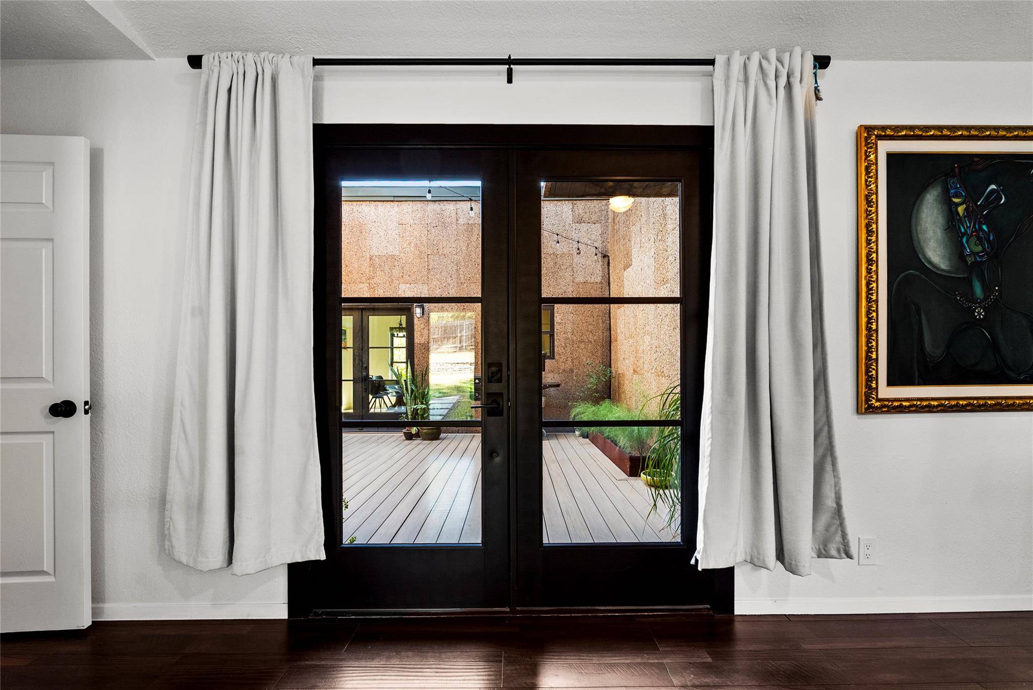 This architecturally unique Southwest Austin home stands apart with a rare 500+ sqft cork-lined atrium at its center, creating a private courtyard that connects the entire home. It's the perfect spot for morning coffee, evening dinners, or simply enjoying the home's natural energy and seamless connection to the outdoors. The main level features three bedrooms and two fully renovated baths, including a spacious primary suite with French doors opening to the atrium and an ensuite with a large walk-in shower, Toto toilet, and Moen fixtures. The kitchen showcases Whirlpool appliances (2023–2025), a new tile backsplash, freshly repainted cabinets, updated hardware, and a breakfast bar that opens to the dining area. Every system has been thoughtfully upgraded for comfort and efficiency: downstairs HVAC with new ductwork, insulation, ERV, and dehumidifier (2020); upstairs Lennox ducted mini-split (2022); Rheem 80-gallon hybrid water heater (2023); and GAF Timberline HDZ roof and gutters (2024). The home also includes Andersen 100 Series windows with Levolor top-down/bottom-up shades, Cat-6 ethernet wiring, hemp-fiber insulation, ZIP-R3 sheathing, Hardie siding, and Elfa shelving in every closet from The Container Store. Upstairs, a private guest suite with a dramatic black steel spiral staircase offers the largest bedroom and bath, ideal for visitors, in-laws, or as a proven short-term rental with excellent income potential. Outdoors, Azek composite decking flows through the atrium and upper balcony, framed by rich Thermacork siding that adds both warmth and performance. A Hercules-covered pergola off the primary suite, Cowboy Pool, and xeriscaped yard with modern patio spaces create a private retreat perfect for relaxing or entertaining under the Texas sky. Ideally located five minutes from shopping and dining, fifteen minutes to Downtown Austin, and under twenty to Dripping Springs, this home perfectly blends sustainability, craftsmanship, and modern Southwest living.