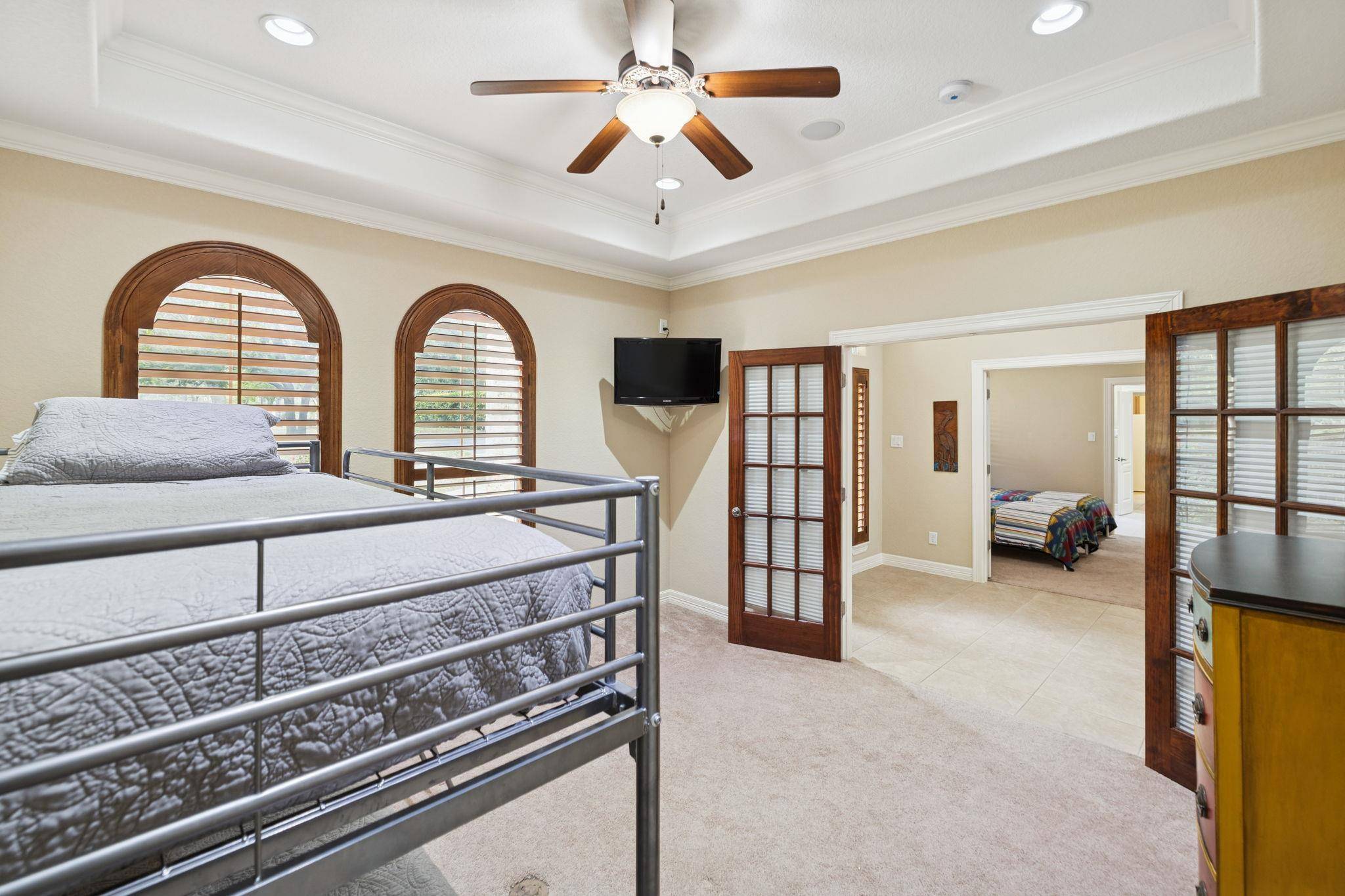 102' of prime Meadow Lake waterfront hits you the moment you arrive. The shoreline is fully dialed in—flagstone patio, lakeside lighting, and dedicated lake-gear storage to keep your toys ready at a moment's notice. A single electric boat lift, dual jet ski lift, and level-ready lake access make getting on the water effortless. And when it's time to play? An elevated deck is already staged for the perfect tree-swing splash. With Meadow Lake's dam construction set for spring 2026, this is a rare chance to lock in true waterfront before demand surges. The property spans 1.18 acres of beautifully maintained grounds, shaded by mature oaks and lined with thoughtfully curated landscaping. A concrete walkway guides you to the water, while the oversized covered patio—complete with lighting, ceiling fans, and speakers—keeps the lake views rolling all day long. Inside, sunlight pours through massive windows framing the water at every angle. Crown molding, recessed lighting, vinyl flooring, and built-in speakers add polish throughout. The kitchen brings space and function with granite countertops, a seating island, walk-in pantry, dual ovens, Jennair gas cooktop, built-ins, and a large dining area with a desk nook. The owner's suite delivers a true retreat: private thermostat, sitting area, direct patio access, and a spa-style en suite with dual shower heads, dual vanity, and a huge walk-in closet. Secondary bedrooms feature French doors, plantation shutters, walk-in closets, and ceiling speakers. A separate guest suite adds its own en suite bath, tray ceiling, French doors, and private outdoor access. Plenty of room for friends, family, and everyone ready to live the lake lifestyle.
