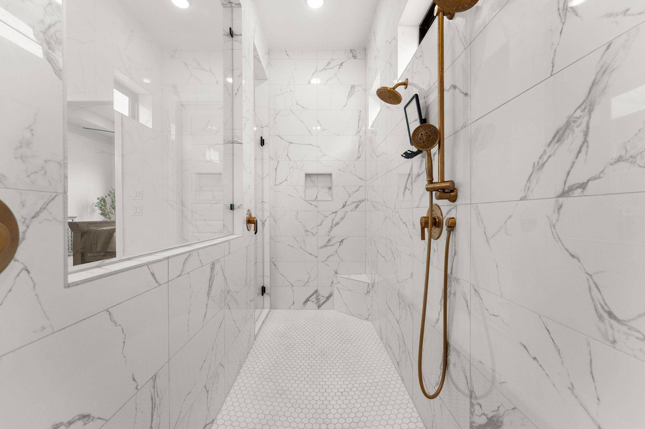 The kitchen offers a large island, quartz counters, stainless steel appliances, gas cooktop, double ovens, and a walk-in pantry. The living room includes a gas fireplace and expansive windows overlooking the greenbelt. The large primary bedroom features high ceilings, two closets, a soaking tub, a walk-in shower, and direct access from the primary closet to the laundry room for added convenience.